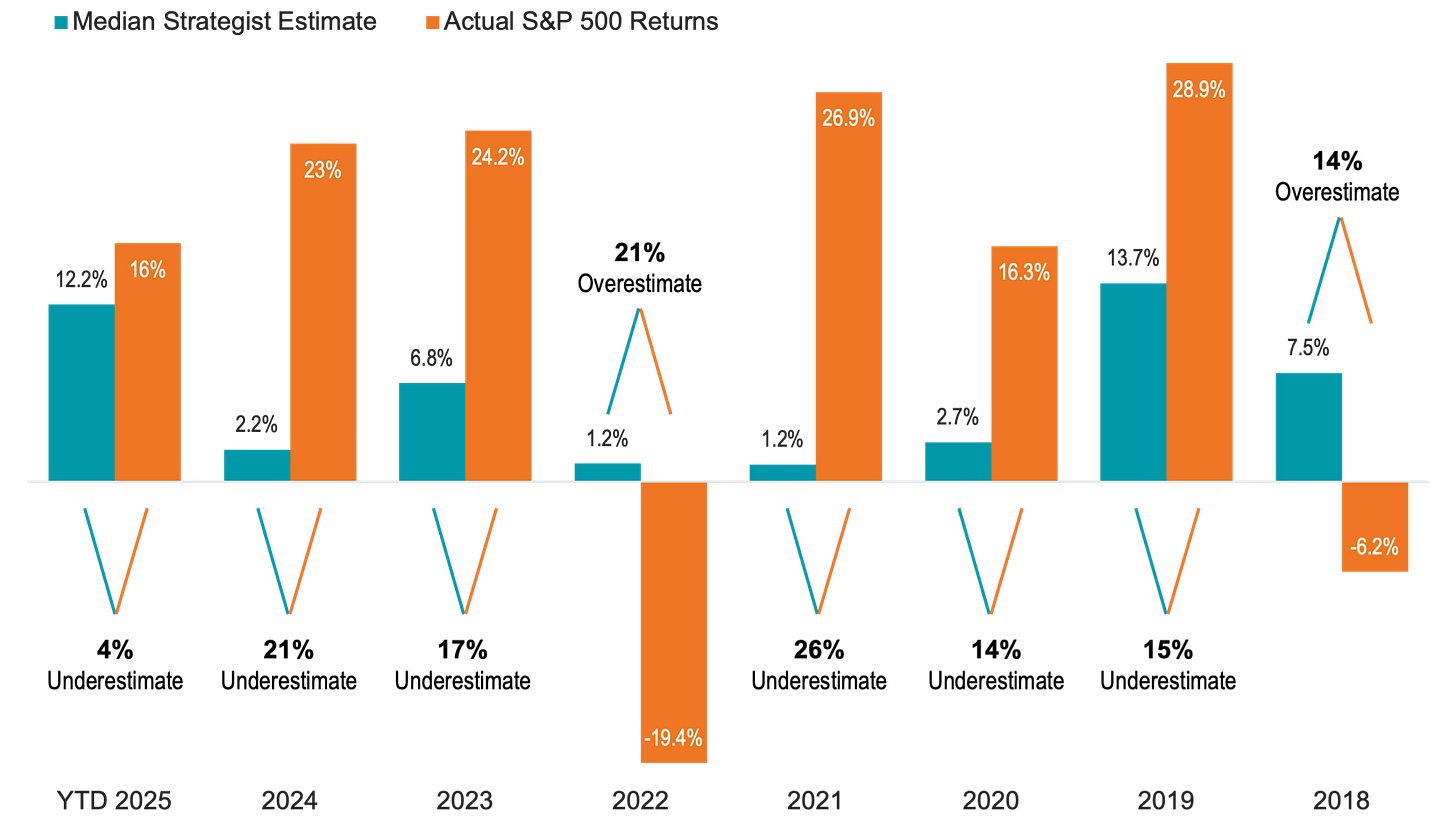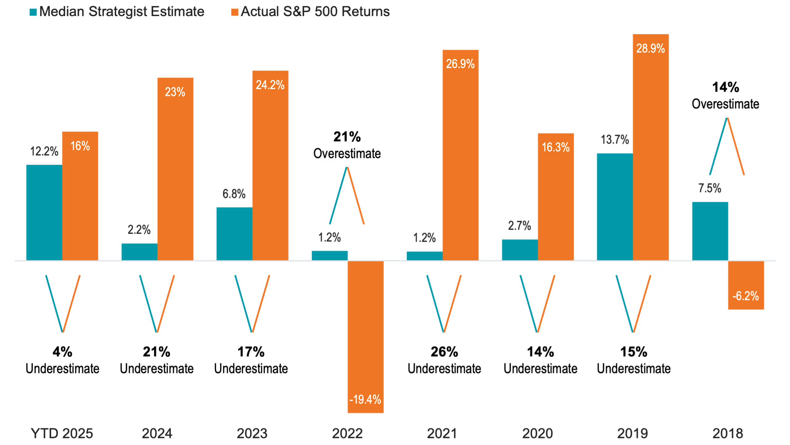 This isn’t to pick on Bitcoin. The same thing happens with every asset. Just look at the chart below comparing the Consensus S&P 500 Estimates with the Actual Returns from 2018-2025.