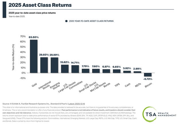 To some extent, all those things happened, but that didn’t stop Bitcoin from being the only asset class in 2025 to lose money (chart as of 12/16/2025).