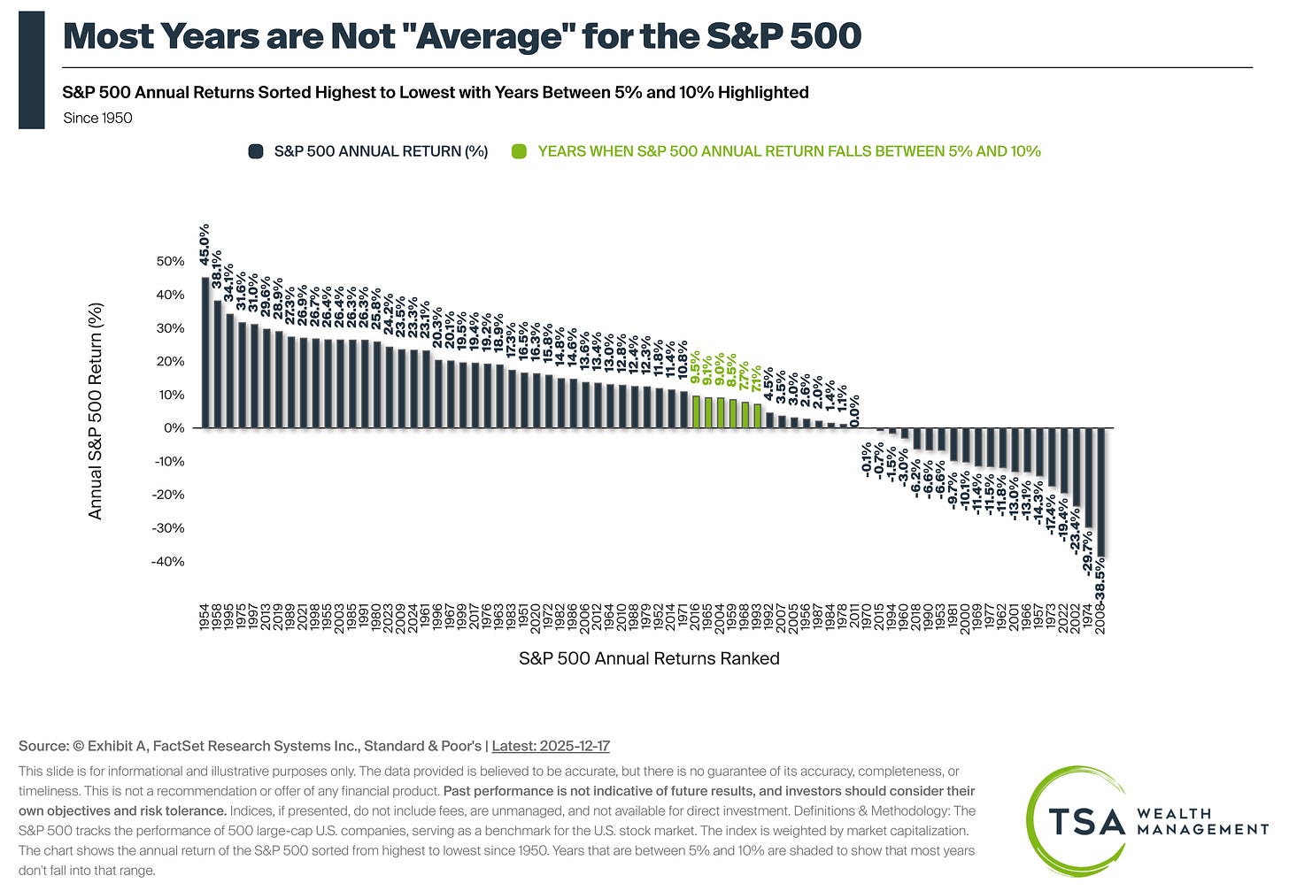 Not even close. In any given year, consensus forecasts for the S&P generally predict average returns, even though that is one of the least likely outcomes. Since 1950, there have only been six years in which the S&P 500 returned between 5% and 10%.