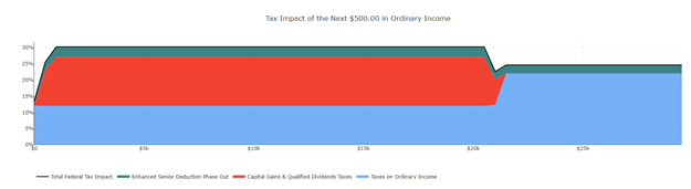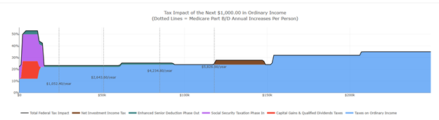 The steep rise was the result of the conversion’s impact on the taxation of their Social Security benefits, capital gains, the phaseout of the Enhanced Senior Deduction, and a step-up in their marginal tax bracket.