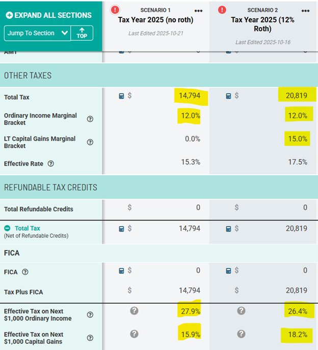 Making the Roth conversion would change the tax rate on their capital gains and begin phasing out the new Enhanced Senior Deduction for those over 65.