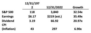 That all sounds bad and scary. However, despite those three instances where the stock market valuations were cut in half (not to mention all the other bad things that happened along the way), from 12/31/1972 to 12/31/2022, the S&P 500 index, earnings, and dividends all went up significantly more than inflation.