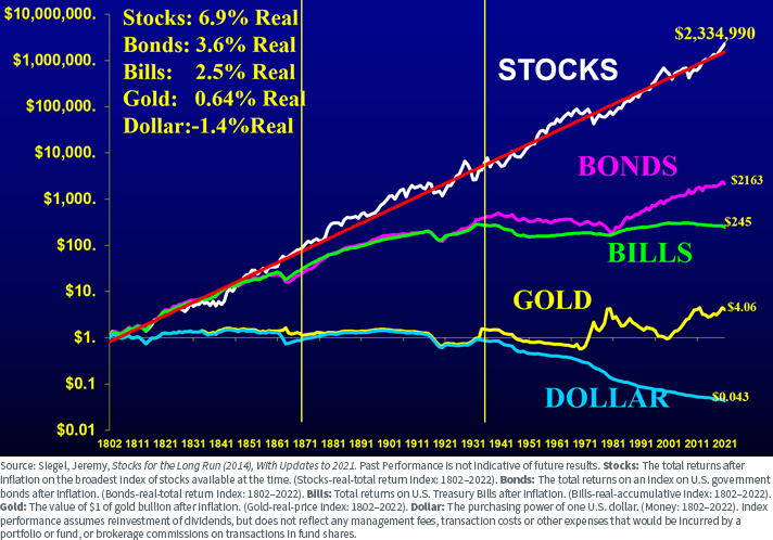 If you are looking for a long-term inflation hedge, we believe you are better off in equities rather than gold. To make the case, we can look at the real return (nominal return minus inflation) of various asset classes going back as long as possible. The above chart (which is an updated version of the chart originally appearing in Jeremy Siegel’s book, Stocks for the Long Run) compares the returns of US Stocks, Bonds, T-Bills, Gold, and Cash from 1802 – 2021. According to this study, $1 invested in US stocks in 1802 had a spending power of $2.3 million in 2021. In comparison, $1 invested in gold over that same period grew in spending power to only $4.06.