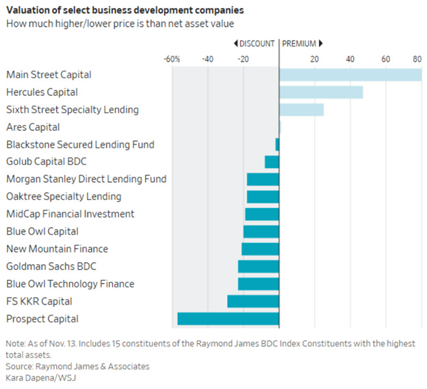 Below is a chart comparing current market values for some of the largest business development companies (private credit lenders) relative to the amounts the companies report their assets are currently worth.