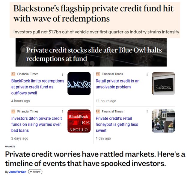 The other issue with the private credit trade is that illiquid investments are being packaged in semi-liquid products for retail investors. Nobody sees this as a problem when times are good. But when times are bad, it causes trouble.
