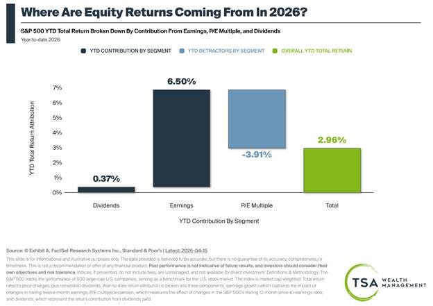 The primary reason the stock market has been going up is that earnings have been going up. Companies are making more money. As the chart below shows, earnings and dividends have collectively contributed nearly 7% to the S&P 500’s total return this year. The only reason the stock market isn’t up further is that people are willing to pay less for those earnings now than they were at the start of the year.