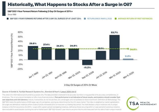 Historically, when oil prices have risen by 20% over two days, as they have recently, the stock market has averaged 24% returns over the next 12 months.