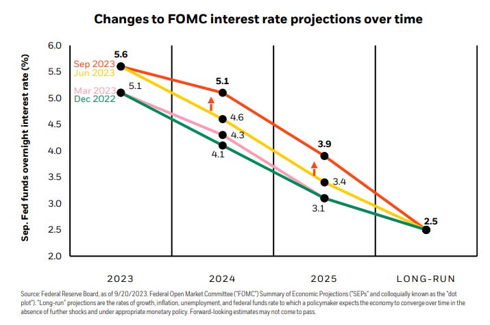 By the start of 2023, the Fed thought we’d get no higher than 5.1% but even that wasn’t high enough. Here we are today up to 5.6%.