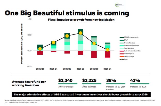 Most of the benefits of this year’s tax bill are going to be recognized over the first few quarters of next year. And as much as the news talks about the tax benefits to the rich, the average refund per worker next year is expected to be $3,225, a 43% increase over 2025.