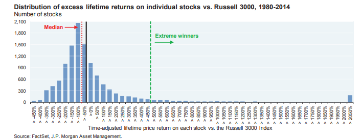 J.P. Morgan Asset Management published the distribution of returns for the Russell 3000 from 1980 to 2014. 40% of all Russell 3000 stock components during that time lost at least 70% of their value and never recovered.