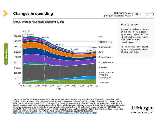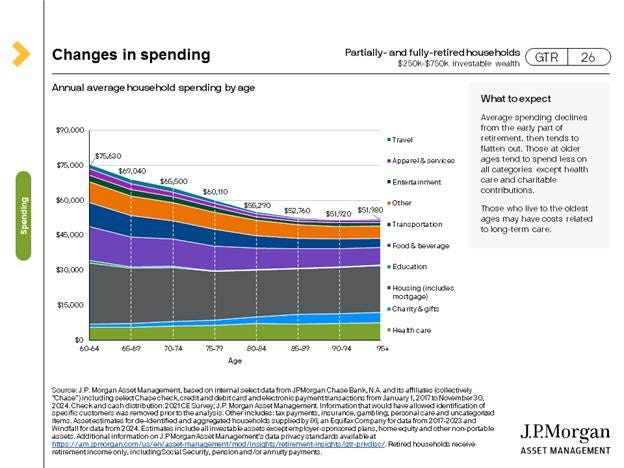 The following charts are from JP Morgan’s 2025 Guide to Retirement. For those with investable wealth between $250 and $750k, spending peaks early in retirement at around $75k and declines to $51k per year as they get older.