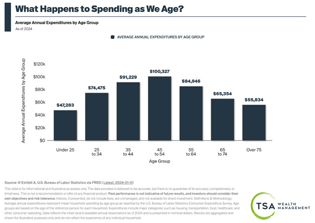 In the real world, spending tends to decline, and what we spend money on changes as we move through different stages of life.