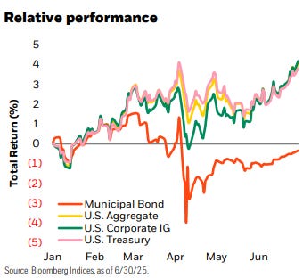 This first chart from BlackRock illustrates the relative performance of munis (the orange line) relative to other parts of the bond market.