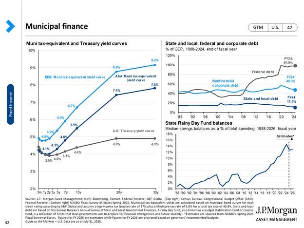 This second chart from JP Morgan illustrates the extent to which tax-equivalent yields surpass those of Treasuries. For someone in the highest tax bracket, there are now 20–to 30–year investment-grade municipal bonds offering tax-equivalent yields that exceed 9%.