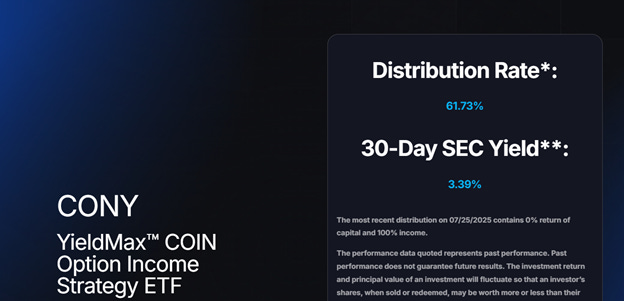 YieldMax creates income ETFs by applying option strategies to securities that don’t normally generate income. Their Coinbase ETF (a fund tied to the performance of Coinbase stock) is a good example. The current yield on ticker CONY is about 60% and the fund gained 41.9% per year from its Aug. 14, 2023 inception through Apr. 30, 2025. Over that period, the ETF received nearly $2 billion in cumulative net inflows, and its daily assets averaged around $560 million.