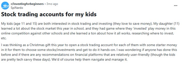I see a lot of articles about why opening a stock trading account for your child is a good way to teach financial literacy, investing, and the value of long-term planning.