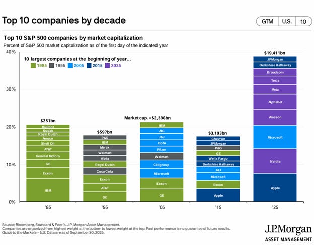 The above chart compares the ten largest companies in the S&P 500 by decade from 1985 – 2025 and makes two important points.