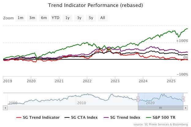 But as this chart comparing the Societe Generale Trend following index points out, from January 2019 to August 6th of this year, while the S&P 500 had a total return of over 180%, the trend following index lost 1.79%.