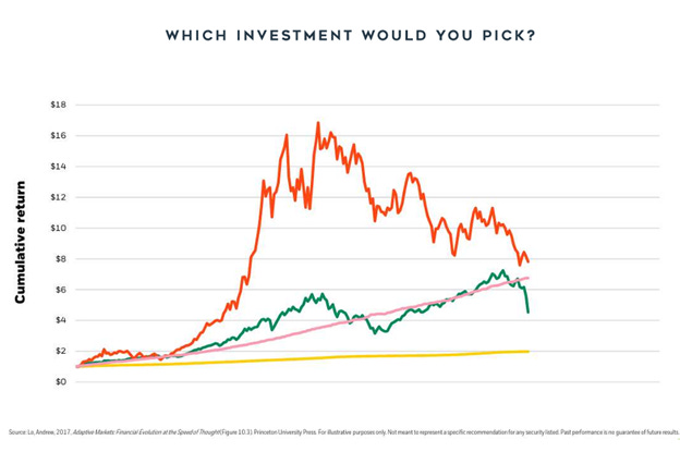 For most people, the orange line seemed too risky, the yellow line didn’t grow fast enough, and why would anyone want the green line instead of the pink?